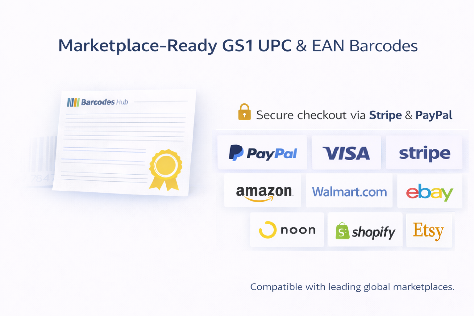 Accelerate your speed-to-market with barcodes that are ready for instant use. Upon purchase, your UPC and EAN numbers are immediately compatible with major global platforms including Amazon, Walmart.com, Shopify, Noon, eBay, and Google Merchant. For Amazon, be sure to check out our barcodes and Amazon page.