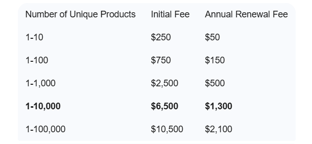 Note: These are approximate fees for GS1 US and can vary by country. Fees are subject to change.